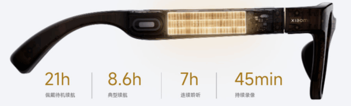 Con un peso de tan solo 40 gramos, las gafas están equipadas con una cámara de 12 MP que permite grabación de vídeo en resolución 2K a 30 fotogramas por segundo. Esta se complementa con un sistema de cinco micrófonos, pensado tanto para capturar sonido de alta calidad como para permitir el control por voz a través del asistente virtual «Super Xiao Ai».