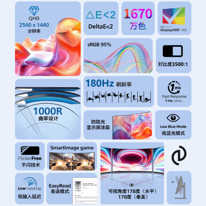 Con un tiempo de respuesta de 1ms GtG, el monitor reduce notablemente el desenfoque por movimiento, lo cual se traduce en una imagen más precisa durante los momentos más intensos del juego. A esto se suma la cobertura de un amplio espectro de color: 98 % del espacio NTSC, 90 % de sRGB y 82 % de DCI-P3, lo que lo hace igualmente adecuado para edición de vídeo o diseño gráfico.
